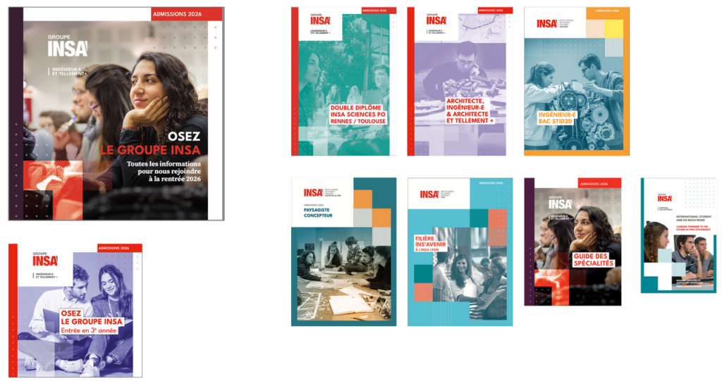 Pour cette nouvelle campagne, le nombre de brochures papier a été revu à la baisse, passant de 17 à 9. Cette simplification de l’offre s’est accompagnée de la refonte totale de la brochure générale. Désormais, une brochure unique, appelée “brochure générale”, s’adresse à tous les candidats, quel que soit leur parcours académique et leur année d’intégration dans un INSA. Ce document est une porte d’entrée vers le Groupe, pour découvrir la richesse de l’offre, le modèle INSA et surtout, les spécificités de toutes nos écoles.