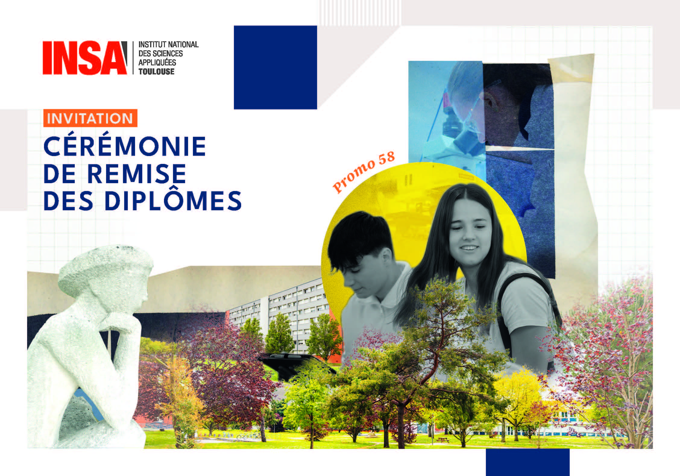 Alexandra Bertron, directrice de l’INSA Toulouse et Laurent Cohen, vice-président du Conseil d’Administration, vous convient à la cérémonie de remise des diplômes de la promotion 58 qui se tiendra le dimanche 16 novembre 2025 à 16h à la Halle aux grains de Toulouse (ouverture des portes à 15h15).